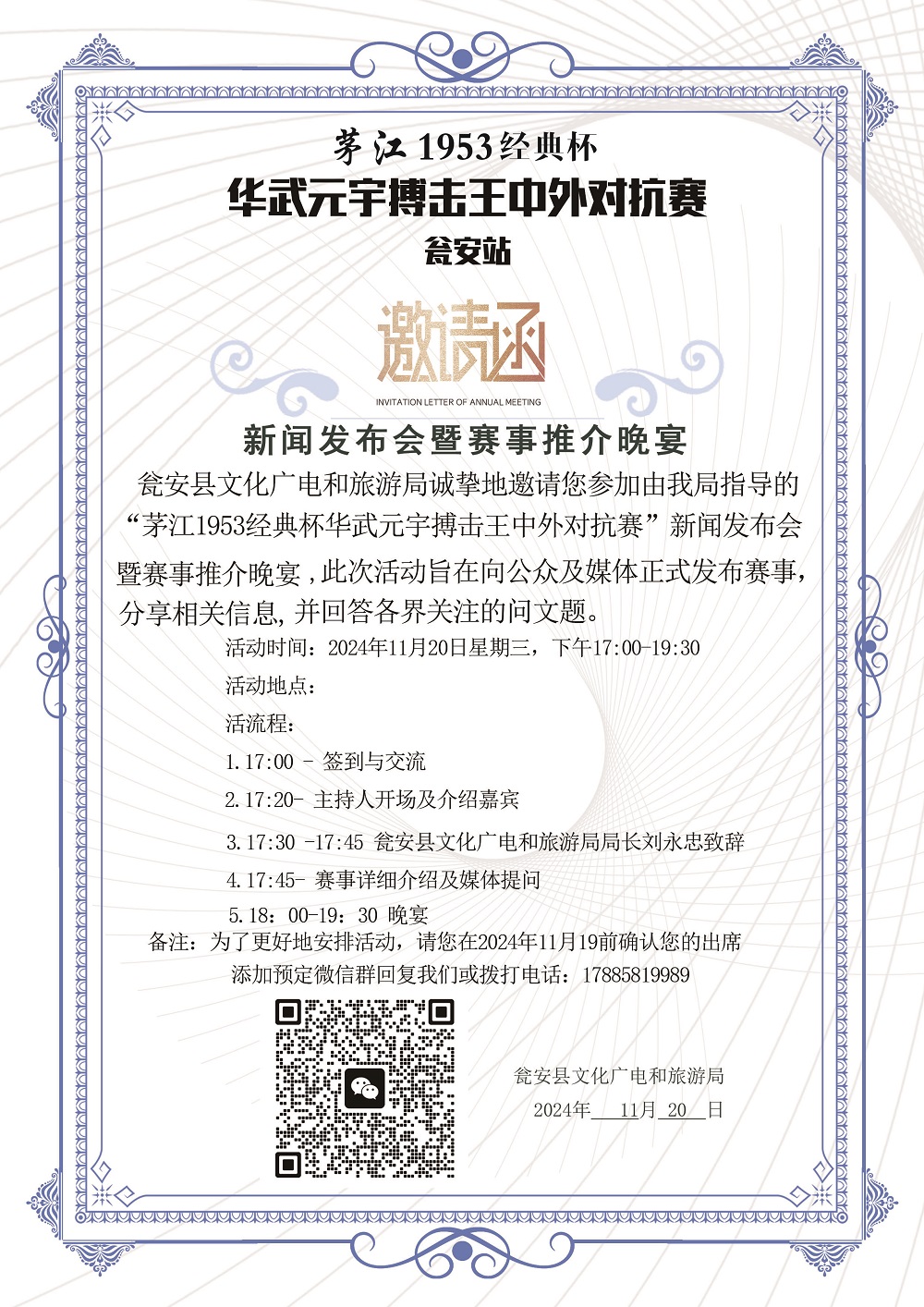 2024年11月20日星期三,瓮安县文化广电和旅游局诚挚地邀请您参加由我局指导的“茅江1953经典杯华武元宇搏击王中外对抗赛”新闻发布会暨赛事推介晚宴。此次活动旨在向公众及媒体正式发布赛事,分享相关信息,并回答各界关注的问题。